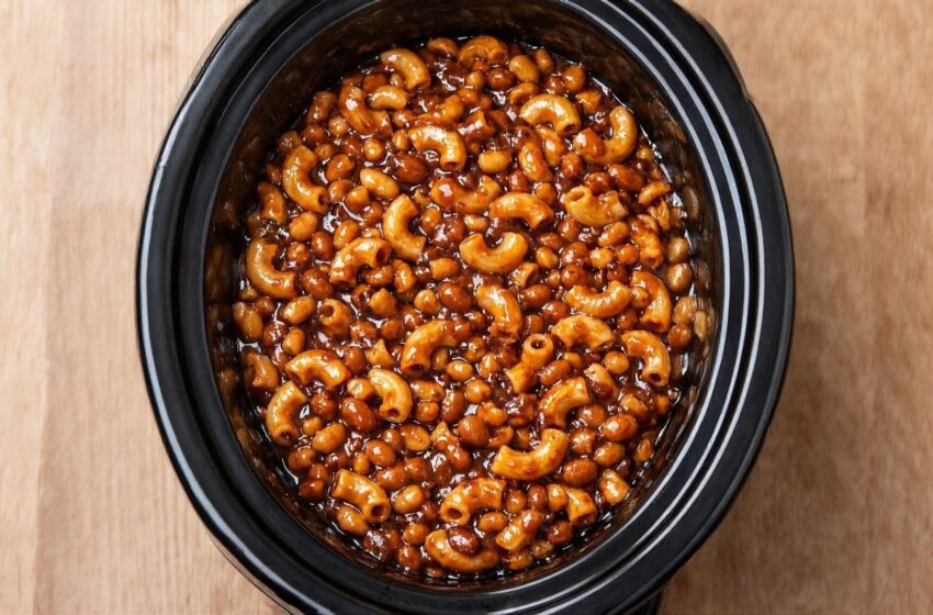It leans heavily on classic Midwestern-style canned baked beans, utilizing their thick, sweet-and-savory molasses sauce to perfectly coat elbow macaroni as it cooks right in the slow cooker! The result is a glossy, sticky pot of tender pasta and navy beans in a rich sauce that feels like a brilliant cross between hearty chili mac and old-fashioned baked beans.