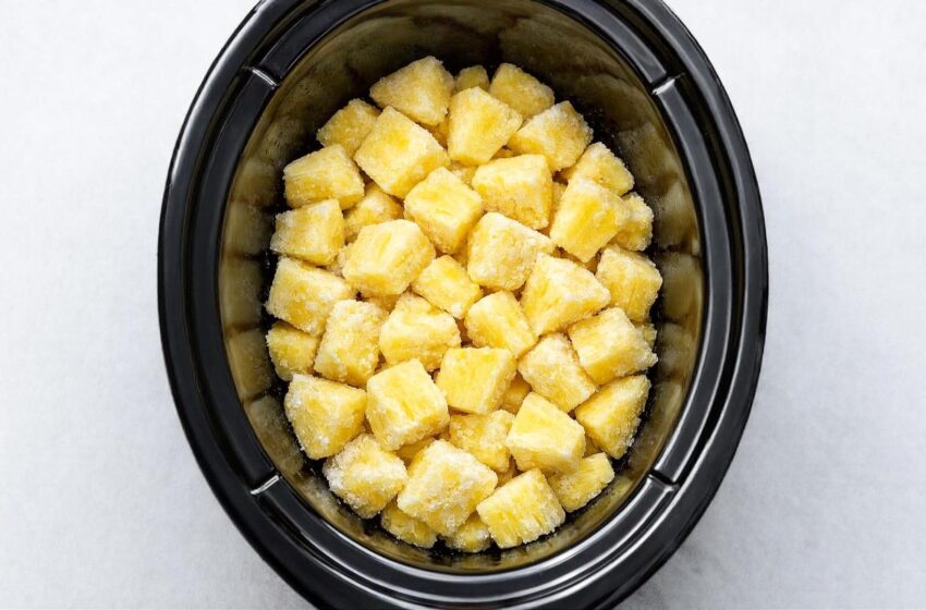 Dump the frozen pineapple chunks directly into the bottom of the slow cooker, spreading them into an even layer.