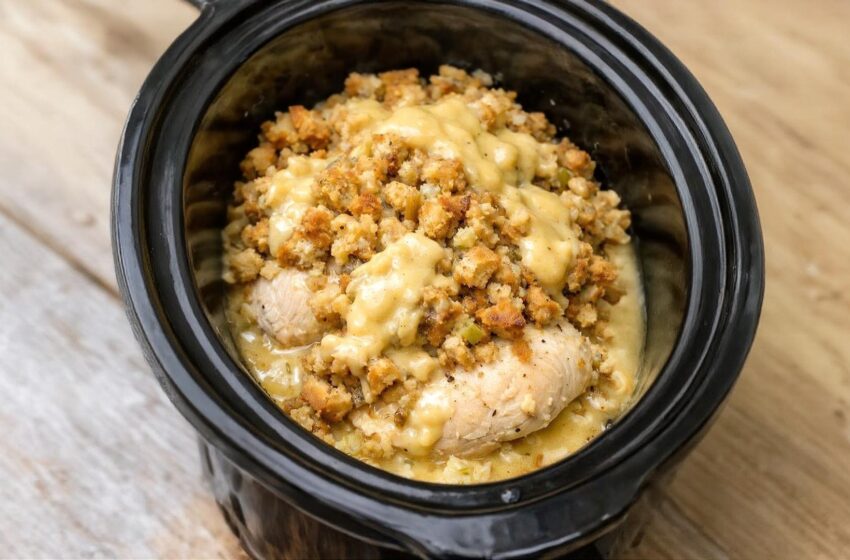 By combining tender chicken breasts with a rich, savory cream sauce and a layer of seasoned stuffing, you get a complete, deeply comforting meal using just four simple pantry staples. The slow cooker traps the moisture, gently braising the chicken until it falls apart, while the stuffing absorbs the savory steam and toasts into a golden, fluffy blanket on top.