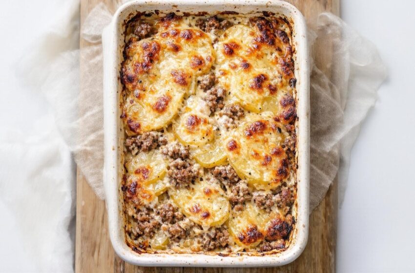 This oven-baked, 4-ingredient vintage beef and potato bake is one of those quietly comforting casseroles that has lived in Midwestern kitchens for decades. It is built from the simplest pantry staples—thinly sliced potatoes, seasoned ground beef, a can of condensed cream soup, and a heavy blanket of melted cheese—all layered into a bubbling, golden masterpiece.