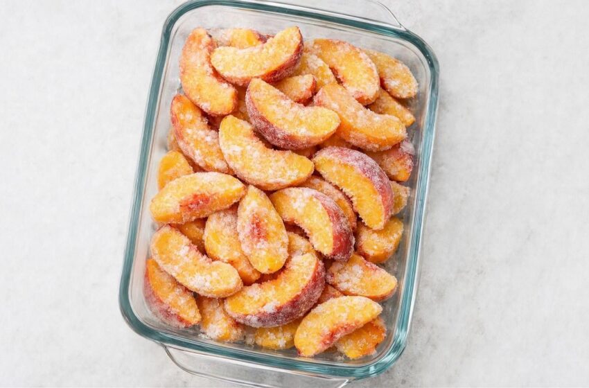Dump the rock-hard, frozen raw peach slices directly into the bottom of the casserole dish and spread them into an even layer. It’s totally fine if they are clumped together or frosty!