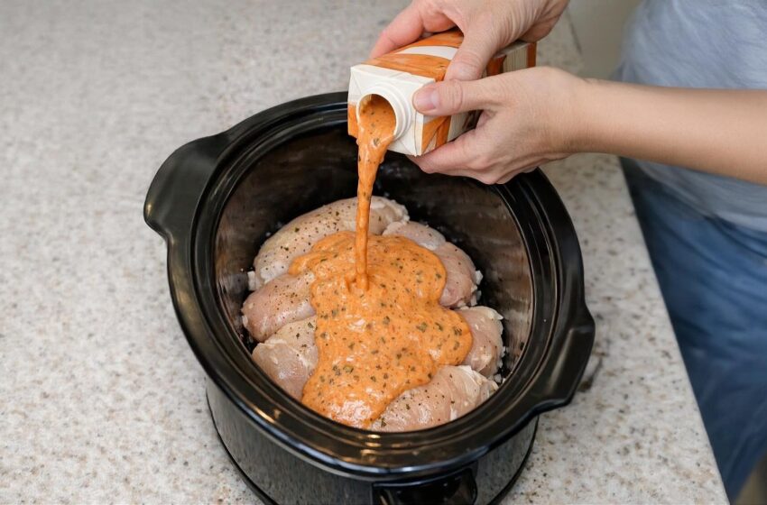 💡 Crucial Step: Pour the creamy tomato basil soup mixture evenly right over the seasoned chicken breasts in the slow cooker! Use a spatula to gently nudge the chicken so the sauce can run underneath and mostly submerge the meat.