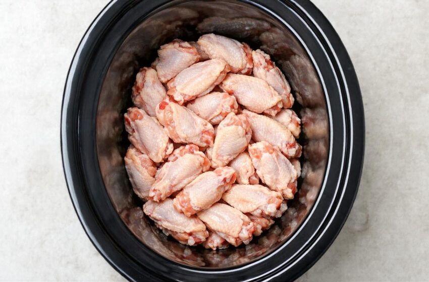 Place the raw, dried chicken wingettes in an even layer on the bottom of a 5- to 6-quart slow cooker. It’s totally fine if they overlap slightly, but try to spread them out as much as possible so the sauce can circulate!