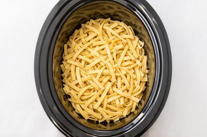 Lightly spray the inside of a 4- to 6-quart slow cooker with nonstick cooking spray to help prevent the starchy noodles from sticking to the ceramic.