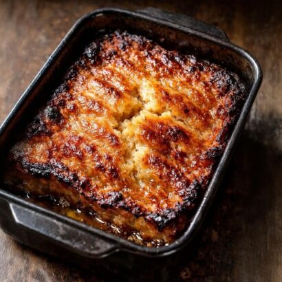 💡 Crucial Step: Pour the broth and cream mixture evenly over the dry fettuccine noodles, making absolutely sure as many noodles as possible are submerged in the liquid. Gently press them down with a spoon to help them sink, but do not stir aggressively!
