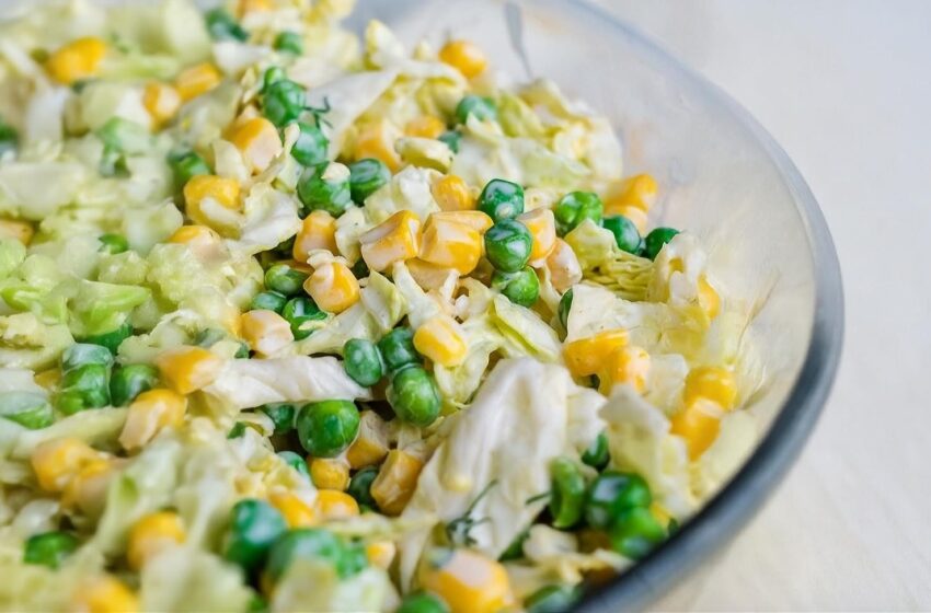 Add the shredded savoy cabbage, the corn kernels, and the sweet peas directly into the bowl with the dressing. Use a large spoon or rubber spatula to toss everything together until the vegetables are completely and evenly coated.