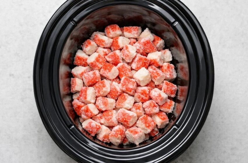 Place the frozen imitation crab chunks in an even layer on the bottom of a 4- to 6-quart slow cooker. The chunks should still be completely solid and icy!