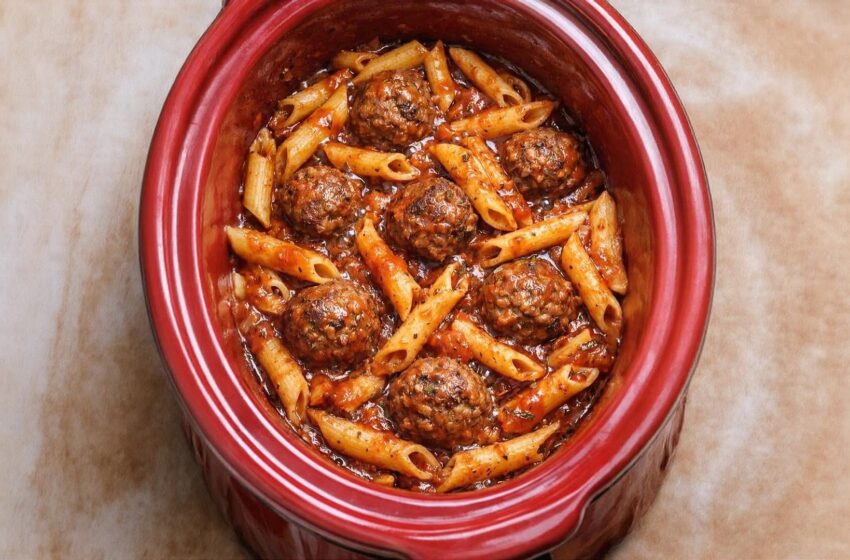 This slow cooker meatball penne is the perfect shortcut for when work runs long but you still crave a cozy, homemade-style dinner. With just three grocery-store staples, the savory sauce and meatball juices soak right into the tender noodles as they cook. Best of all, there is no boiling water or extra pans required!