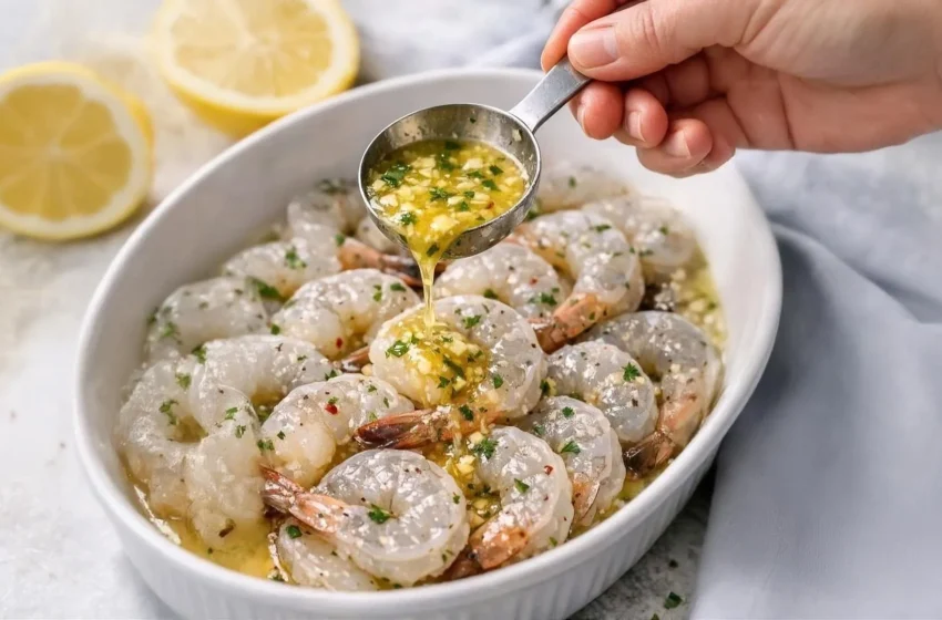 Step 4: The Lemon Butter Sauce In a small, microwave-safe bowl, melt your butter. Stir your minced garlic, lemon zest, and fresh lemon juice directly into the warm butter. Let it sit for 1–2 minutes so the garlic softens slightly and releases its oils. Pour this warm mixture evenly over the top of the shrimp.